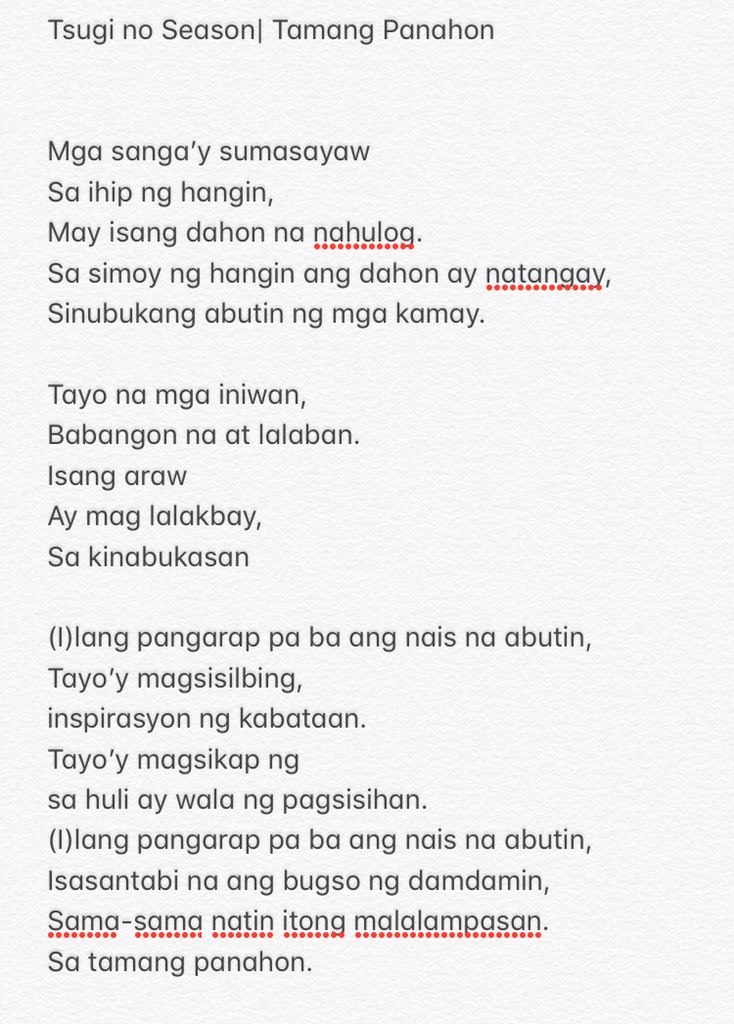 Tayo'y mga dahon lamang meaning. Pareho tayong mahuhulog sa lupa. Jul 06 2017 Mula sa awiting At Tayoy Dahon ng bandang Asin Tayoy mga dahon lamang Ng isang matatag na puno Iisa ang ating pinanggalingan Hindi pareho sa pagtubo Maaaring ikay isang dahong masigla Ako namay dahong nalalanta na Pareho tayong mahuhulog sa lupa Kaibigan wag ikabahala Ang salitang dahon ayon sa awitin ay hindi literal na. GAWAIN 10- Unawain at talakayin ang awiting narinig at iugnay sa nakaraang talakayan.
