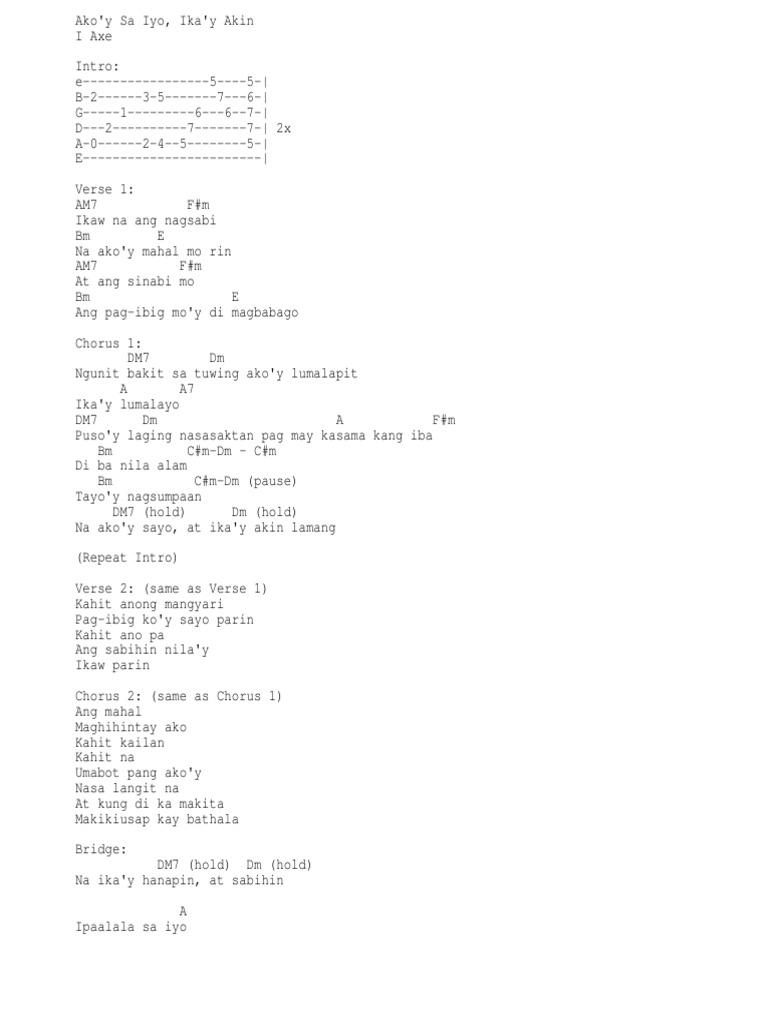 Jun 29 2016 Akoy Sa Iyo Ikay Akin I Axe Intro e-----5----5- B-2-----3-5-----7---6- G-----1-----6---6--7- D---2-----7-----7- A-0-----2-4--5-----5- E-----x2 Verse 1 AM7 Fm Ikaw na ang nagsabi Bm E Na akoy mahal mo rin AM7 Fm At ang sinabi mo Bm E Ang pag-ibig moy di magbabago Chorus 1 DM7 Dm Ngunit bakit sa tuwing akoy lumalapit A. Author jasminmagbanua a 51.